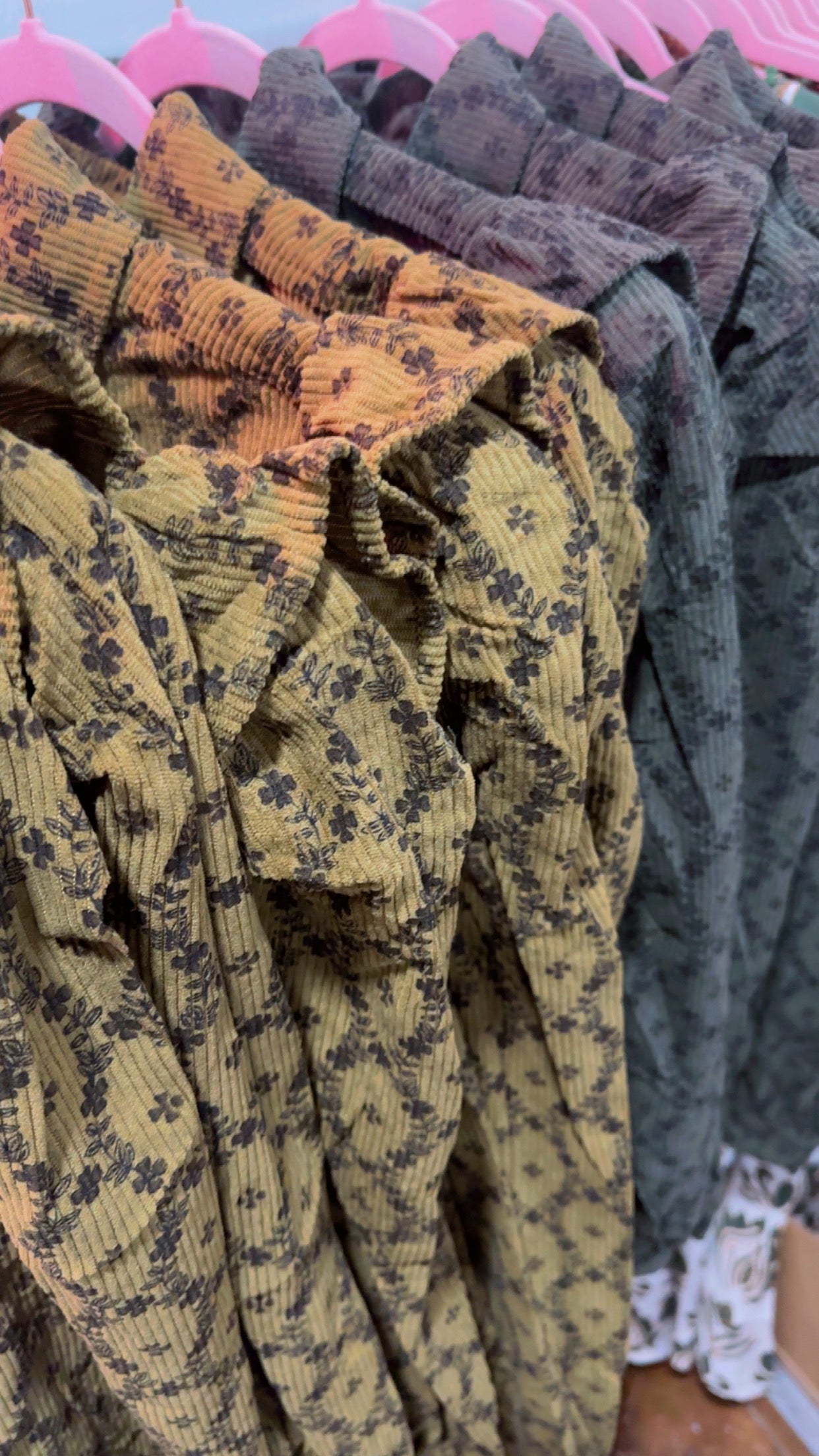 Floral Print Corduroy Button Down with Ruffled Shoulders
