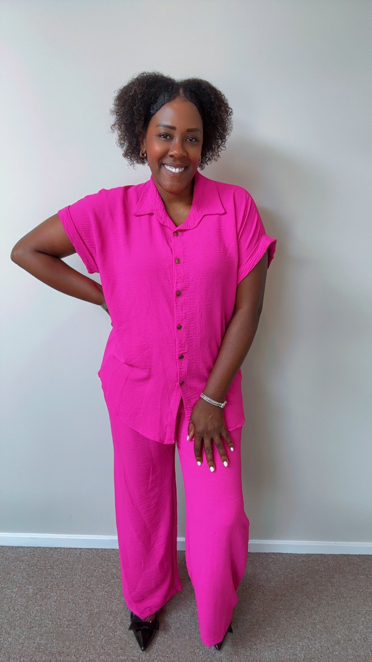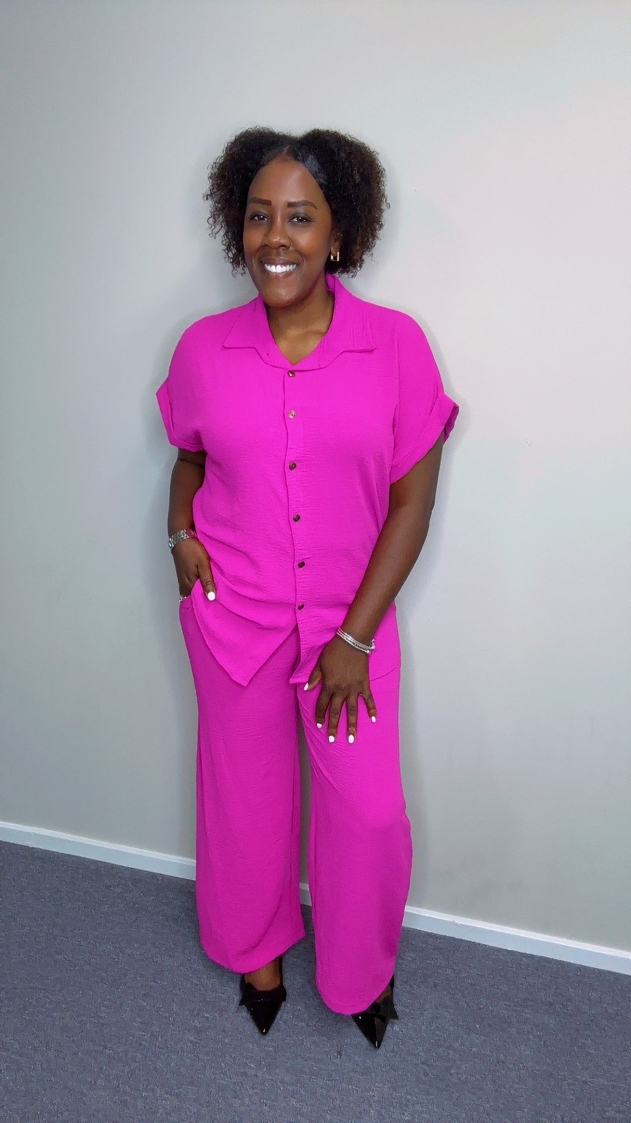 Turn heads in this gorgeous magenta pant set! The pants have pockets and an elastic waistband.