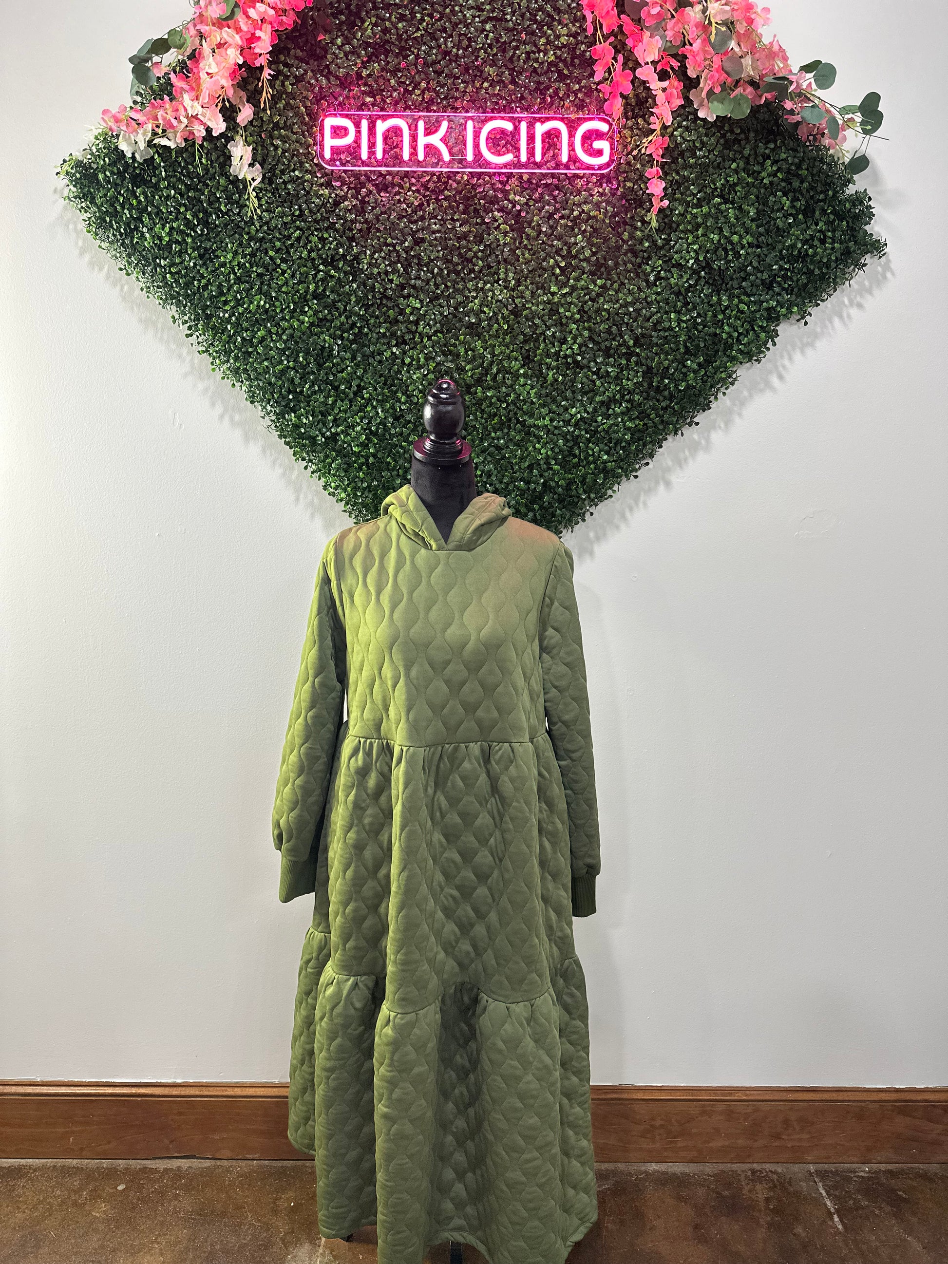 Elevate your style with this stunning quilted dress featuring a hood and pockets. Stay cozy and warm during chilly days and nights while looking stylish and trendy.