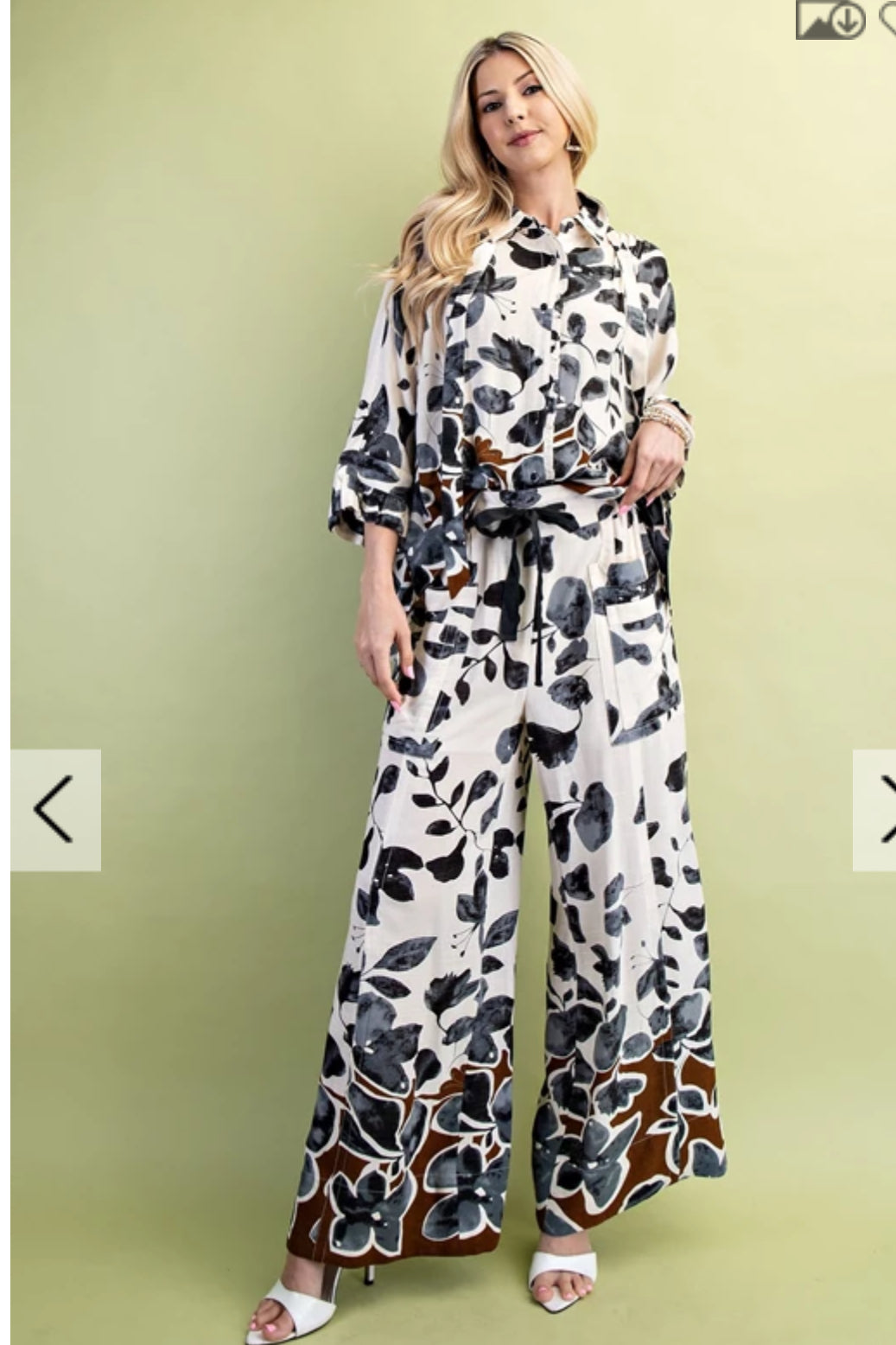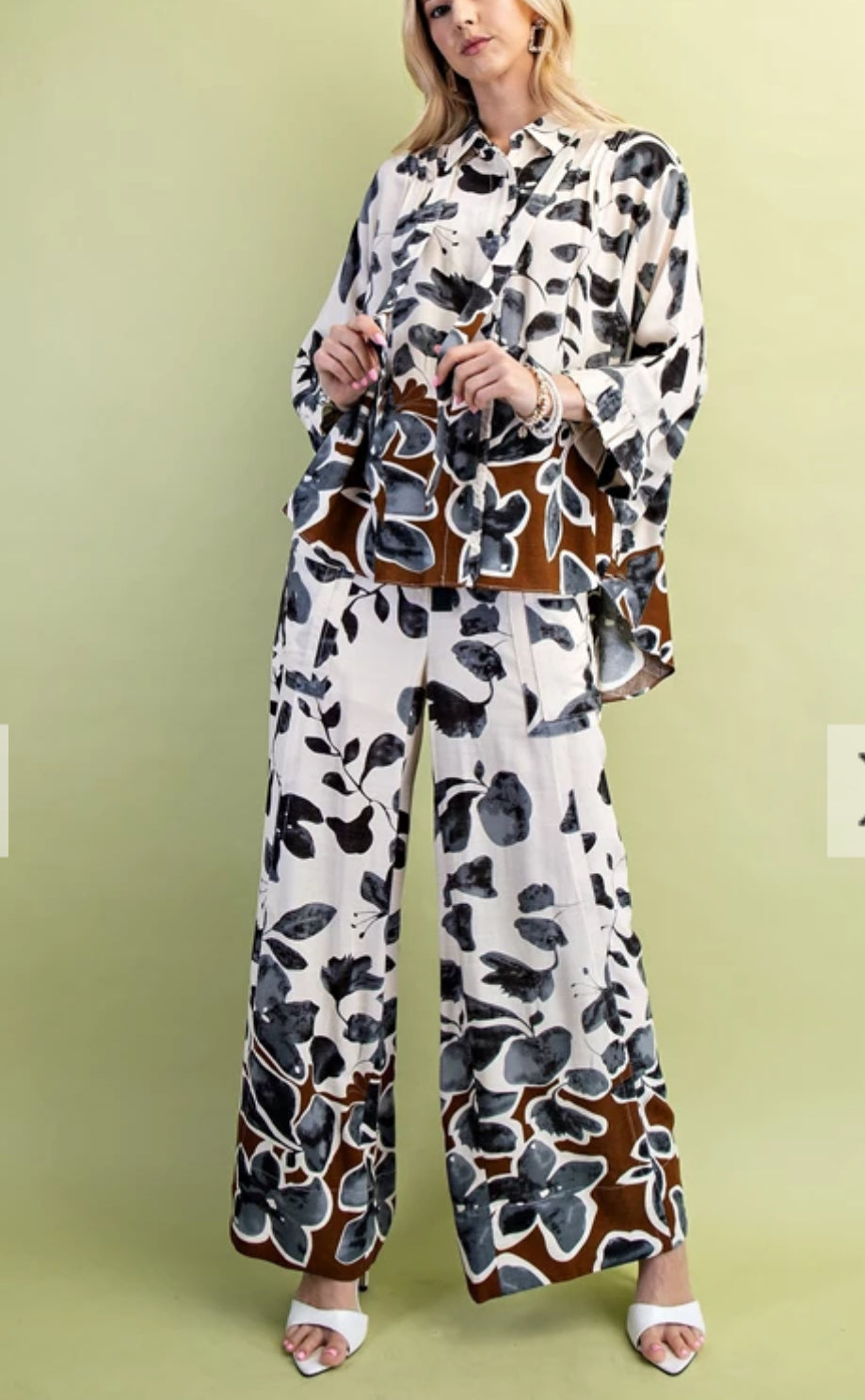 Ruffled Leaf Print Button Down Blouse with a Detachable Neck Tie and Pintuck Details